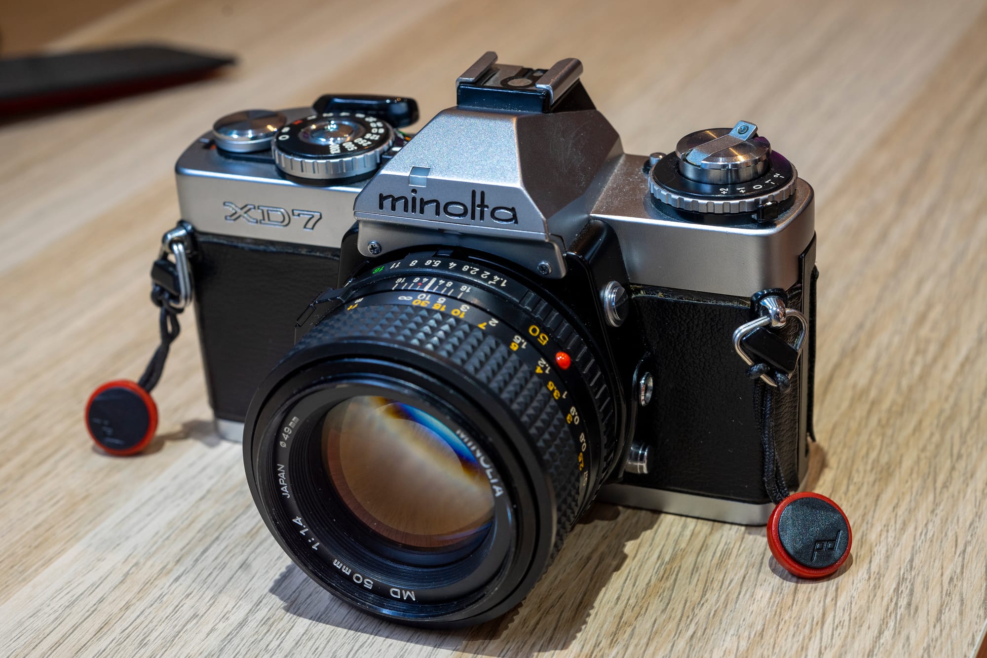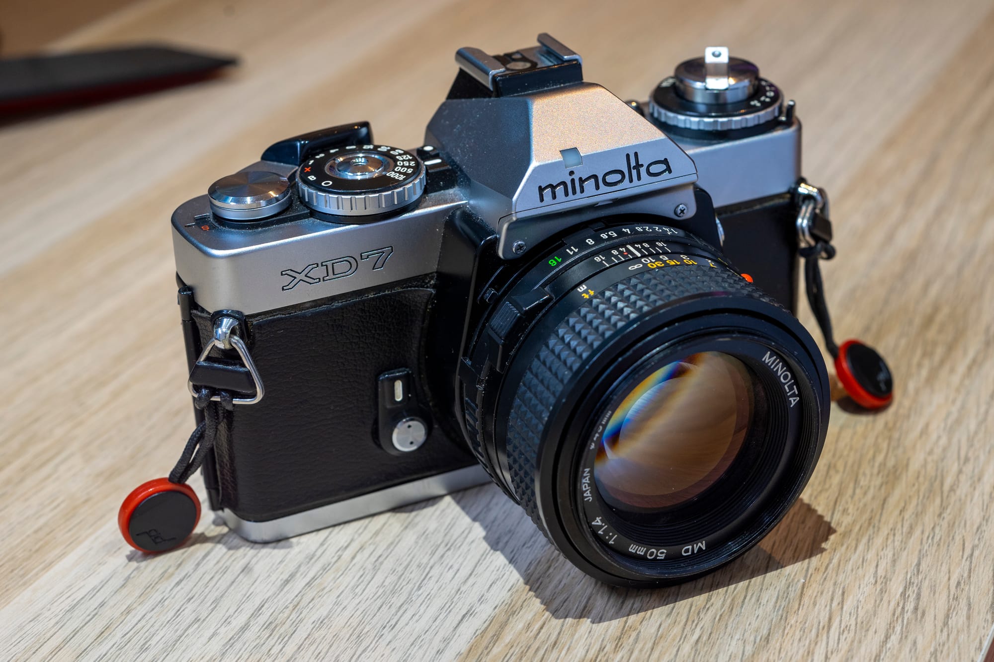 Enter the Minolta XD (also known as the XD-7 and XD-11): this seemed like the perfect choice. By many it's regarded to be the best camera Minolta ever made, and so far I think I have to agree with them. It's an extremely well built camera: metal wrapped in leather with a smooth winding lever and a nice shutter button, well-thought-out ergonomics, a lighter and more compact body than the previous SR mount cameras, an amazing focusing screen, automatic exposure modes, support for an autowinder: this camera really has it all.